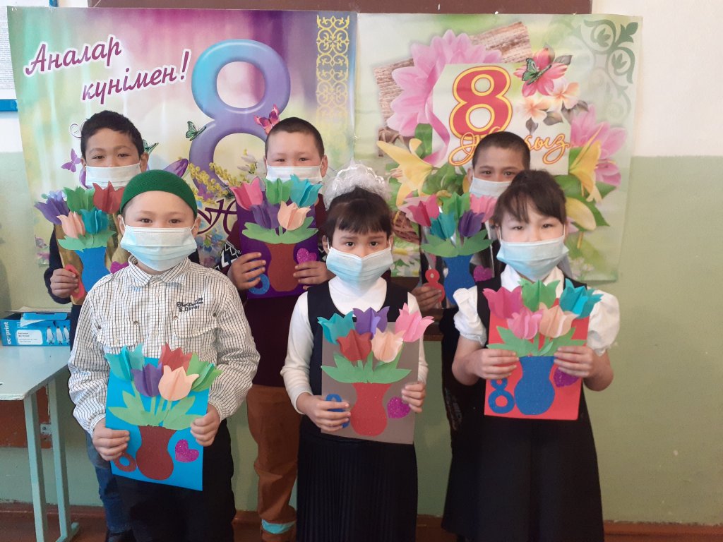 8 наурыз мерекесіне орай оқушылар аналарына өз қолдарынан сыйлықтар жасады. Аналарына өздерінің әндері мен өлең жолдарын жолдады.