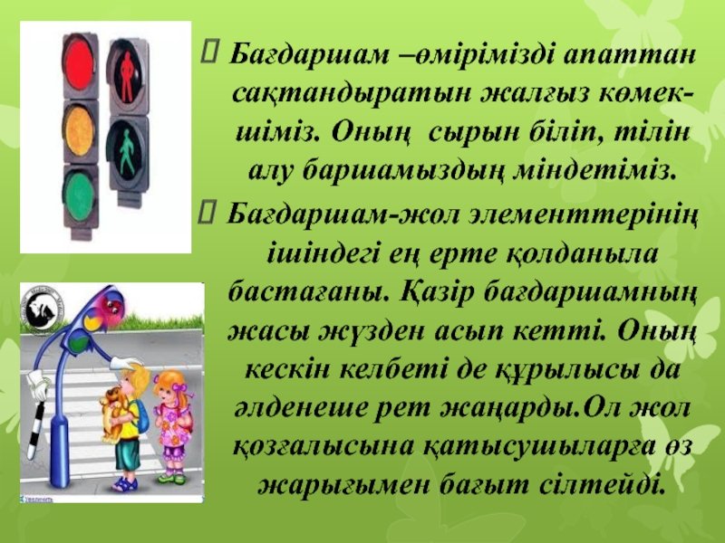 Бағдаршам жол ережесінің маңызды бір бөлшегі. Бағдаршам жайлы дұрыстап , мұқият оқып ,біліп алу керек. Жол ережесін үнемі сақтап, мұқият болу керек. Балаларға жол ережесімен алғашқы күннен оқыту керек. Бағдаршамда 3 түтекше болады. 1 -і - қызыл түсті, қызыл түсті түтекше...